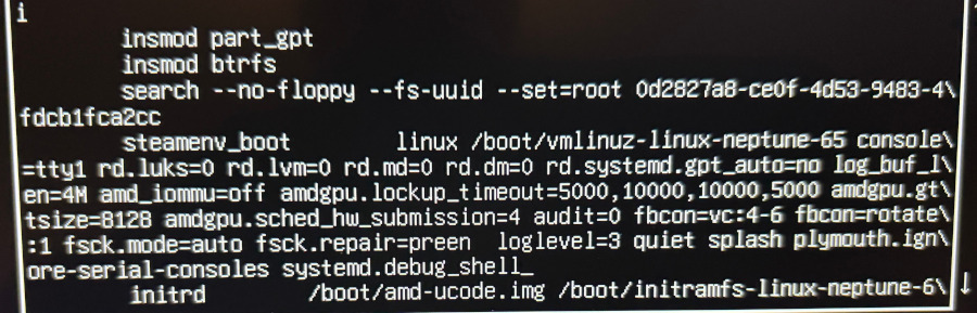 - 注意:如果没有找到视频中所说的 fbcon=ratate:1 的话,可以先找到以“steamenv_boot”开头的行,然后按键盘上的 End 到达该行的末尾,之后再进行下面的操作。