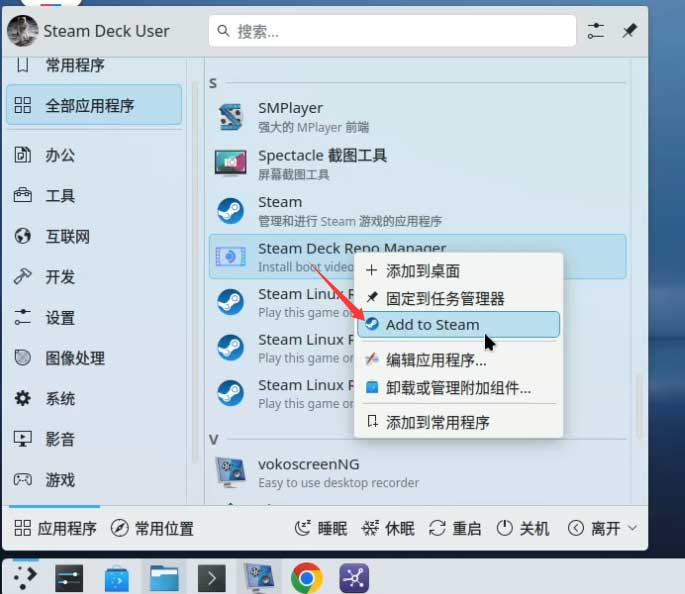 - 安装完成后,点击左下角开始菜单 – 全部应用程序 – 右侧列表里面找到 Steam Deck Repo Manager,右键点击它并且选择 Add to Steam 添加到Steam库。