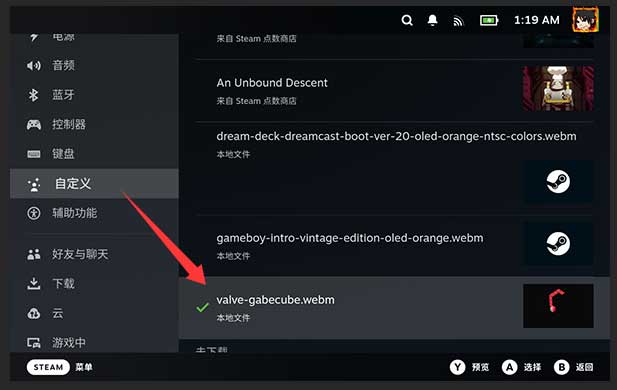 - 下载完成的动画都会显示在 SteamDeck 的 设置 – 自定义 里面,这样子我们就可以自由选择自己喜欢的动画来当开机动画啦,而且不需要点数兑换,完全免费。