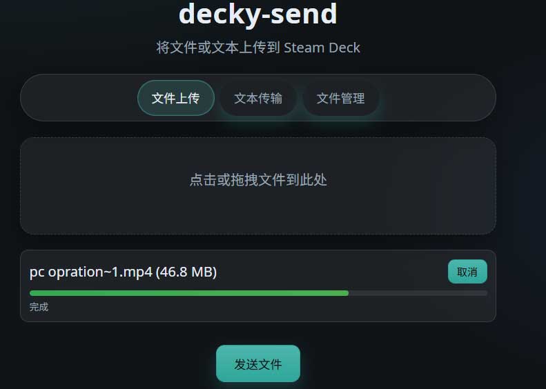 - 文件上传:点击或拖拽文件到上传区域,你所上传的文件默认将保存在 Steam Deck 的